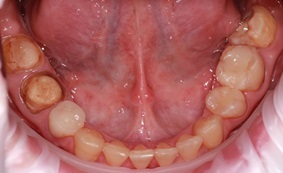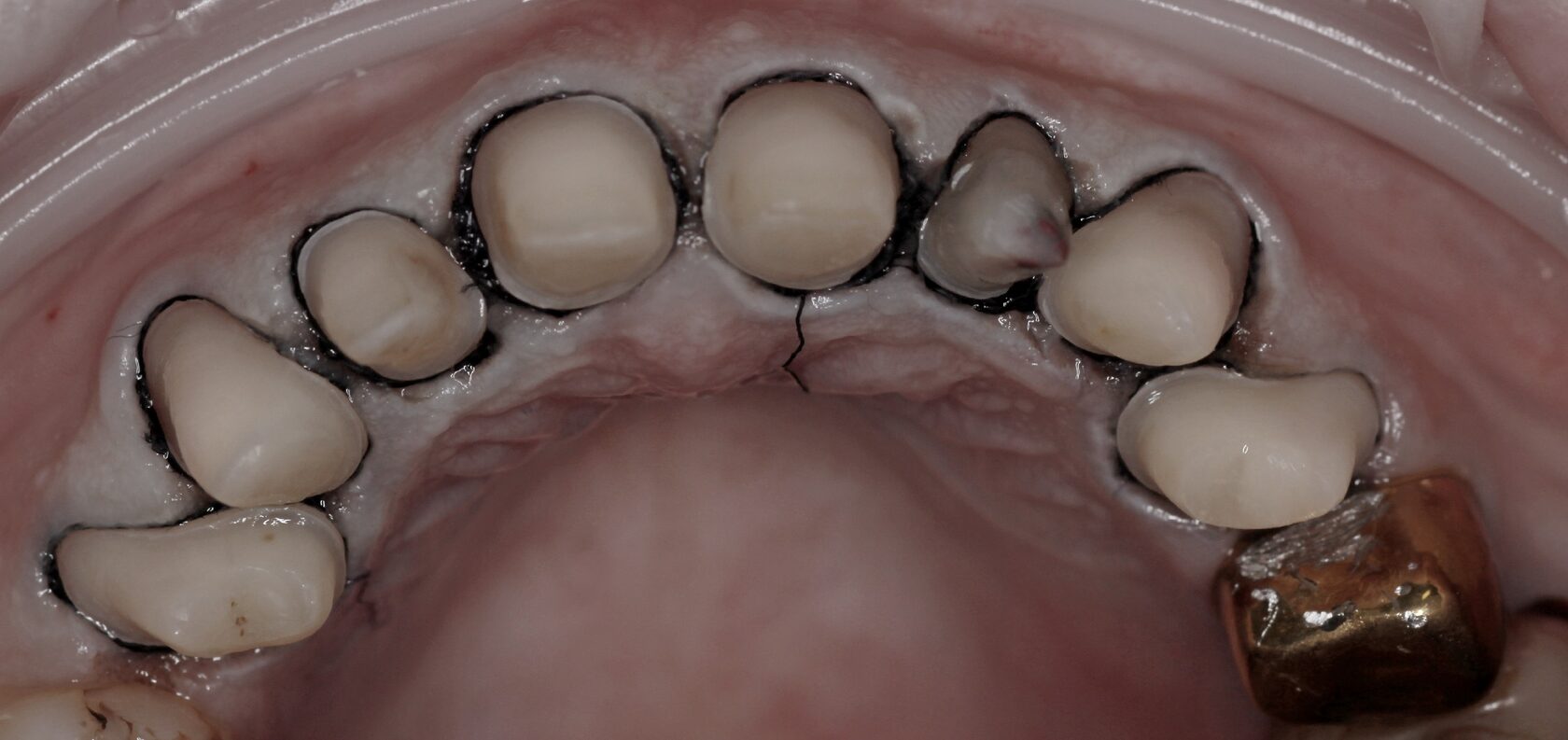 Из анамнеза: врожденный костный дефект твердого неба, компенсирован пластикой слизистой оболочки. Зубы 2.1, 2.2. потеряны в результате костного дефекта. Ранее проведено ортодонтическое лечение в течение 3 лет, с целью оптимального позиционирования окклюзионных взаимоотношений зубных рядов верхней и нижней челюстей. Совершенные ранее пластики мягких тканей не дают желаемого удовлетворительного эстетического результата.